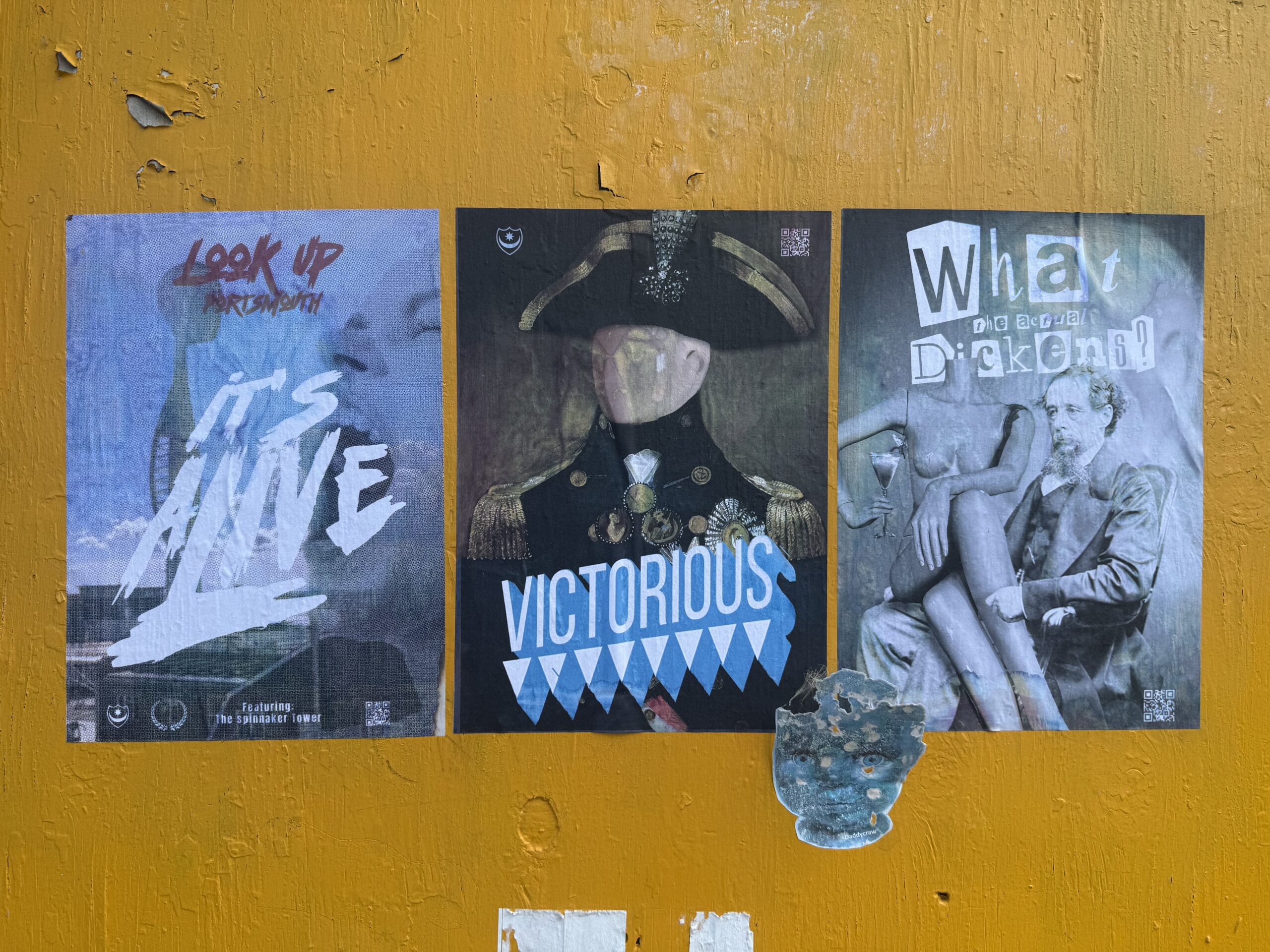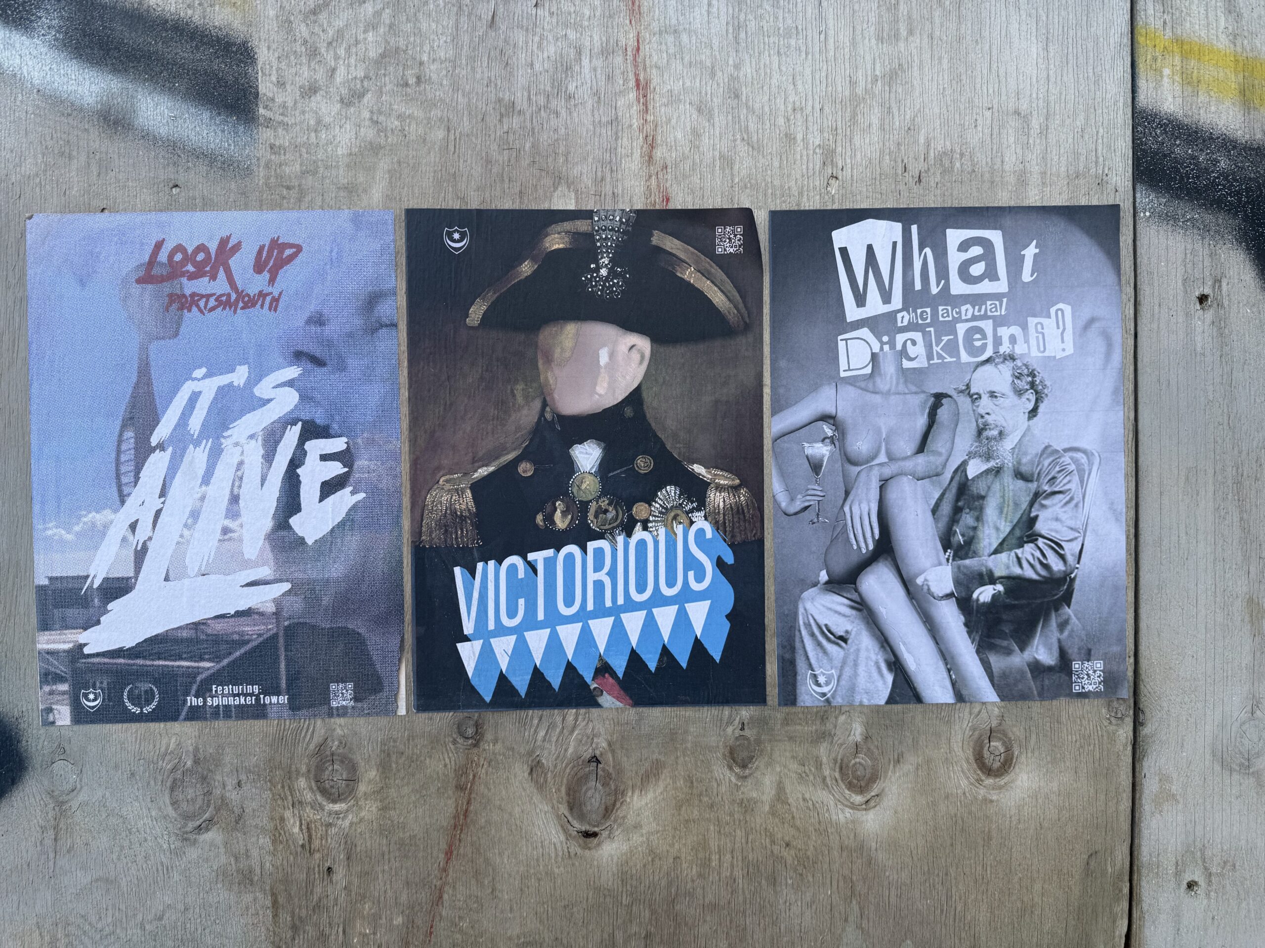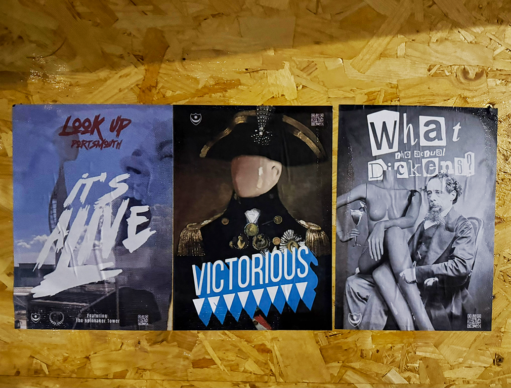 Victorious is a starting point for a new strand of work – one that takes Portsmouth’s monuments, myths and skyline and reimagines them through the lens of spectacle, subversion and popular culture. From Nelson, Charles Dickens, the Spinnaker Tower, and an old mannequin salvaged from the Debenhams in Southsea before it closed, these icons of the city are re-cast as part of a living stage set, a festival of images that refuses to stay static. This post will collect works and documentation as the series unfolds – beginning with a poster that frames the Spinnaker as a 1950s sci-fi apparition, looming and alive above the city – It’s Alive!